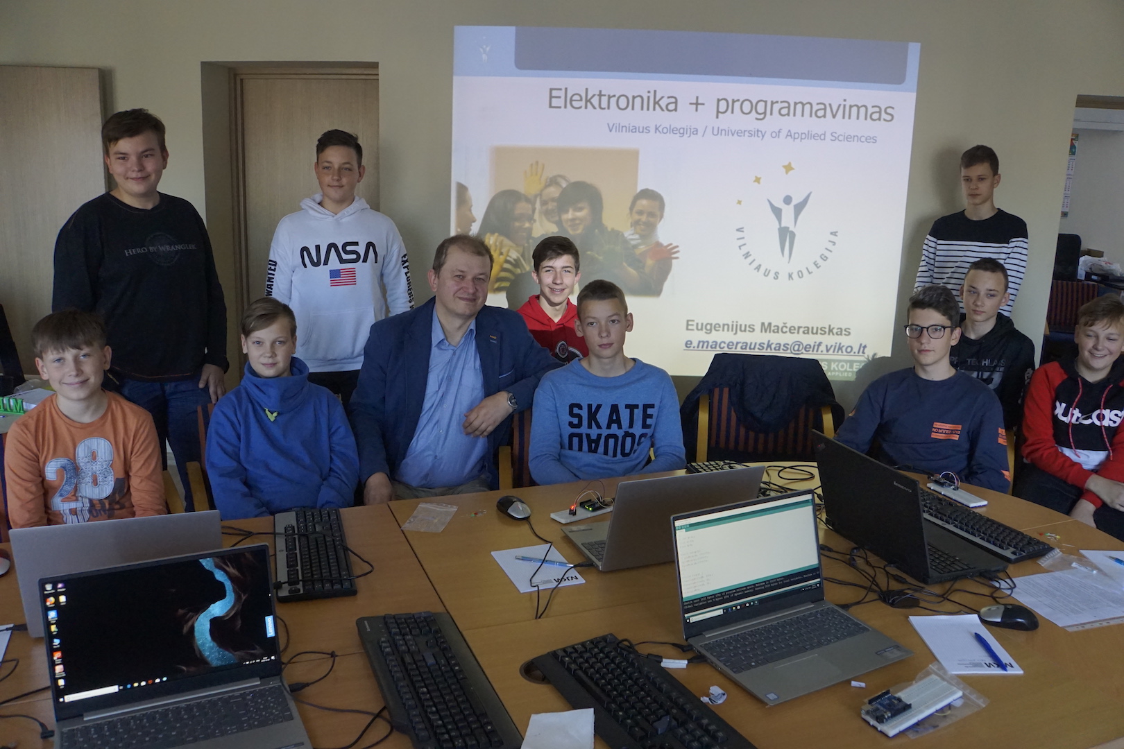 Spalio 6 d. Technologijų centro vedėjas, Elektronikos katedros dėstytojas Eugenijus Mačerauskas dalyvavo Marijampolės jaunųjų kompiuterininkų mokyklos mokslo metų atidarymo šventėje. Renginio metu Vilniaus kolegijos lektorius skaitė paskaitą apie elektronikos ir programavimo sąsajas šiuolaikinėse technologijose, bei pravedė praktinius elektroninių įtaisų programavimo užsiėmimus moksleiviams. Vizito metu lektorius pristatė Vilniaus kolegiją, Elektronikos ir informatikos fakultetą ir parodė gražų pavyzdį, kaip skirtingų sektorių bei regionų bendradarbiavimas gali atnešti gražių ir turiningų rezultatų. Džiaugiamės gražiomis iniciatyvomis ir tikimės, kad ateityje tokie bendradarbiavimai taps dar stipresni.