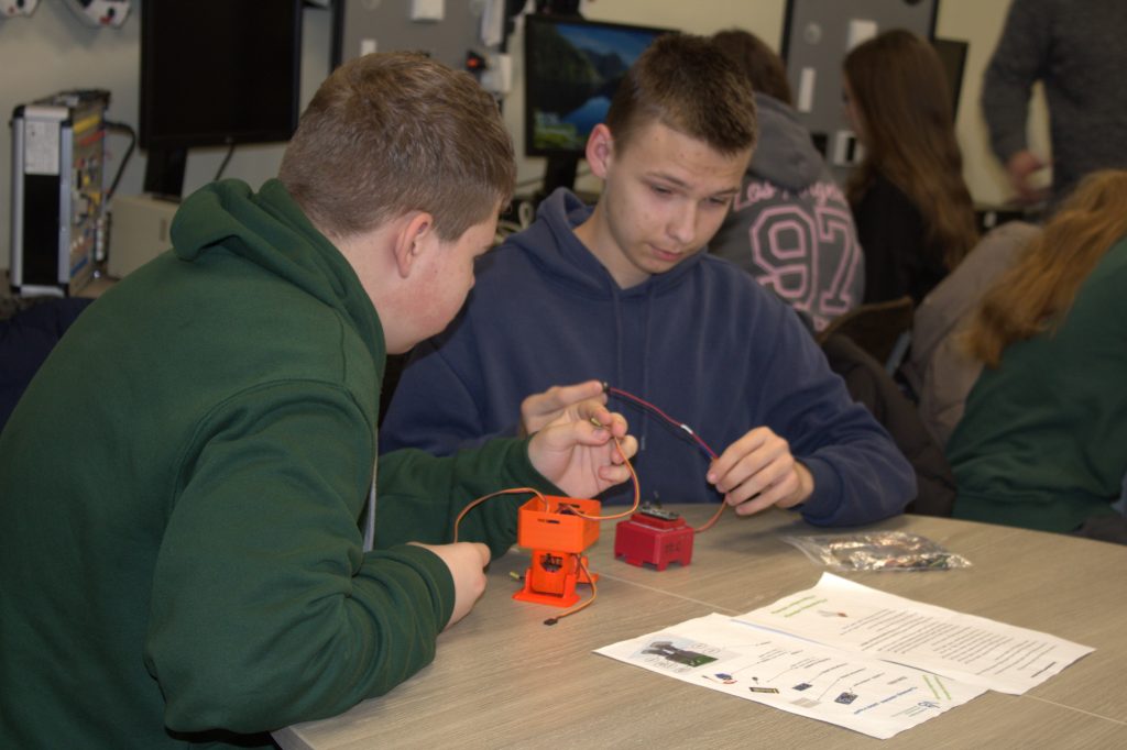 Mokiniai aktyviai įsitraukė į robotų gaminimo veiklą ir domėjosi visu kūrimo procesu.
