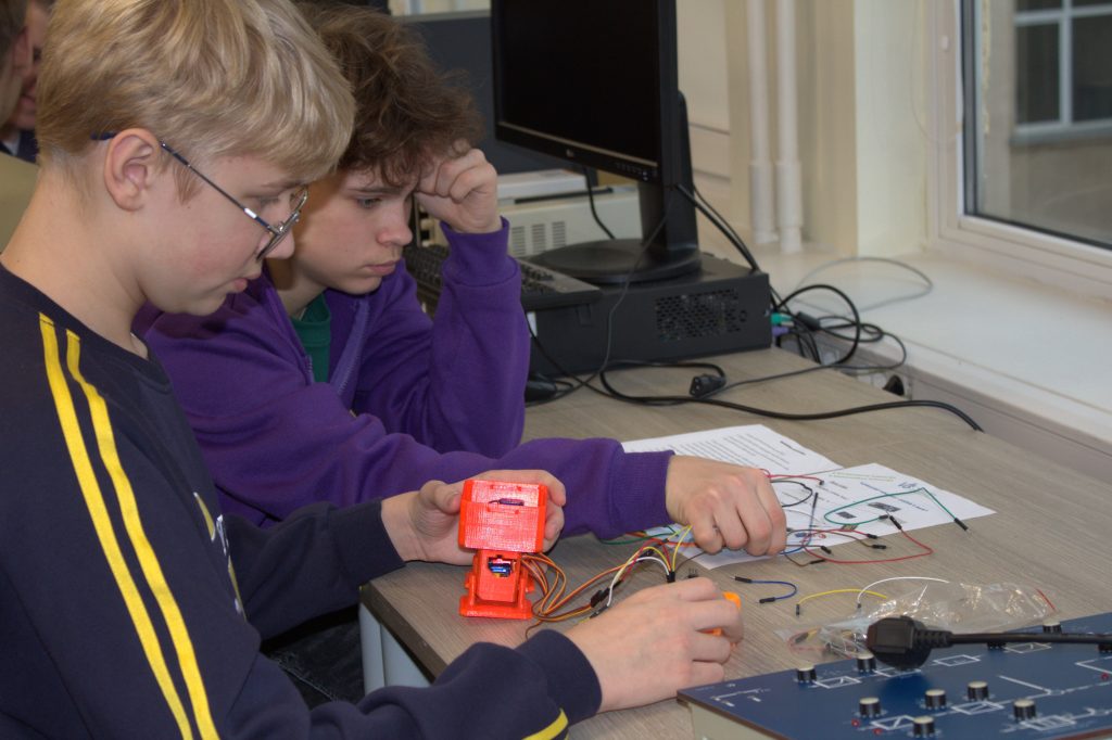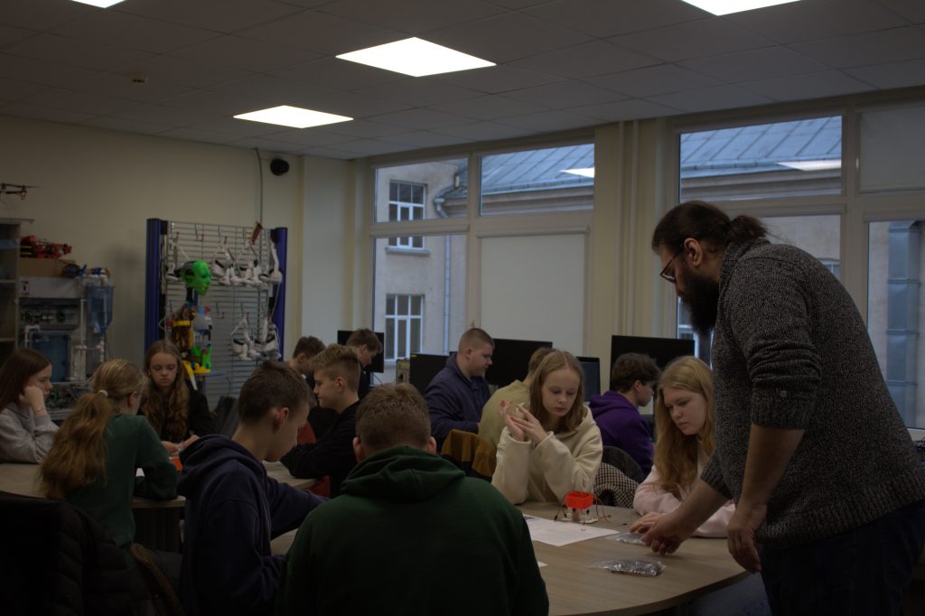 Užsiėmimo metu moksleiviai gavo robotukų rinkinius, instrukcijas ir visas reikiamas priemones. Jie kruopščiai jungė laidelius, žingsnis po žingsnio sekė instrukcijas ir atidžiai klausė lektoriaus patarimų.