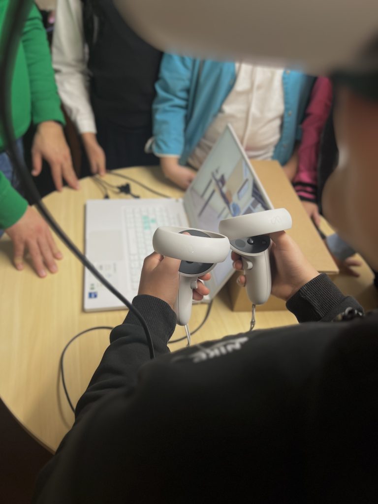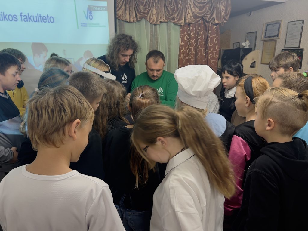 Fakulteto atstovai moksleiviams vedė interaktyvią pamoką, kurios metu dalyviai galėjo išbandyti šuniukų-robotų valdymą, virtualios realybės akinius ir susipažinti su informacinių technologijų bei elektronikos pasauliu iš arčiau.