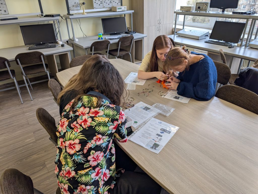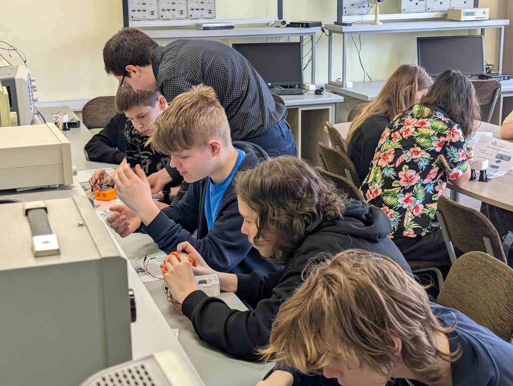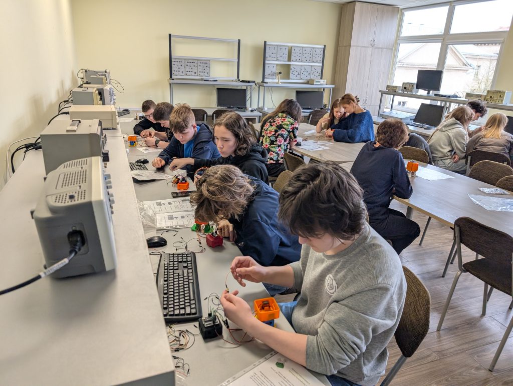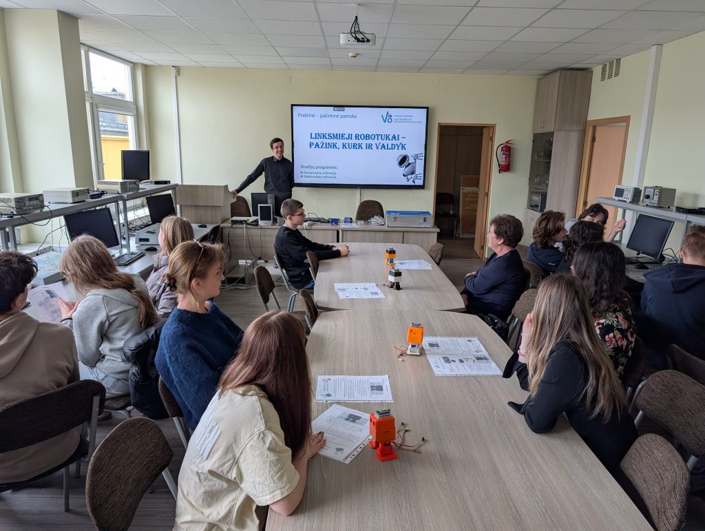 Elektronikos ir kompiuterių inžinerijos katedros dėstytojas Mantas Vanagas moksleiviams pravedė edukacinę pamokėlę „Linksmieji robotukai – pažink ir kurk“, kurios metu svečiai turėjo progą pagaminti veikiantį robotuką, jungiant atitinkamus laidelius.