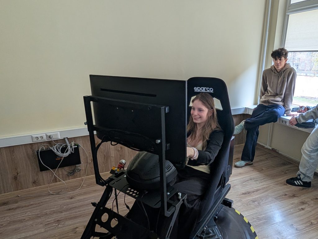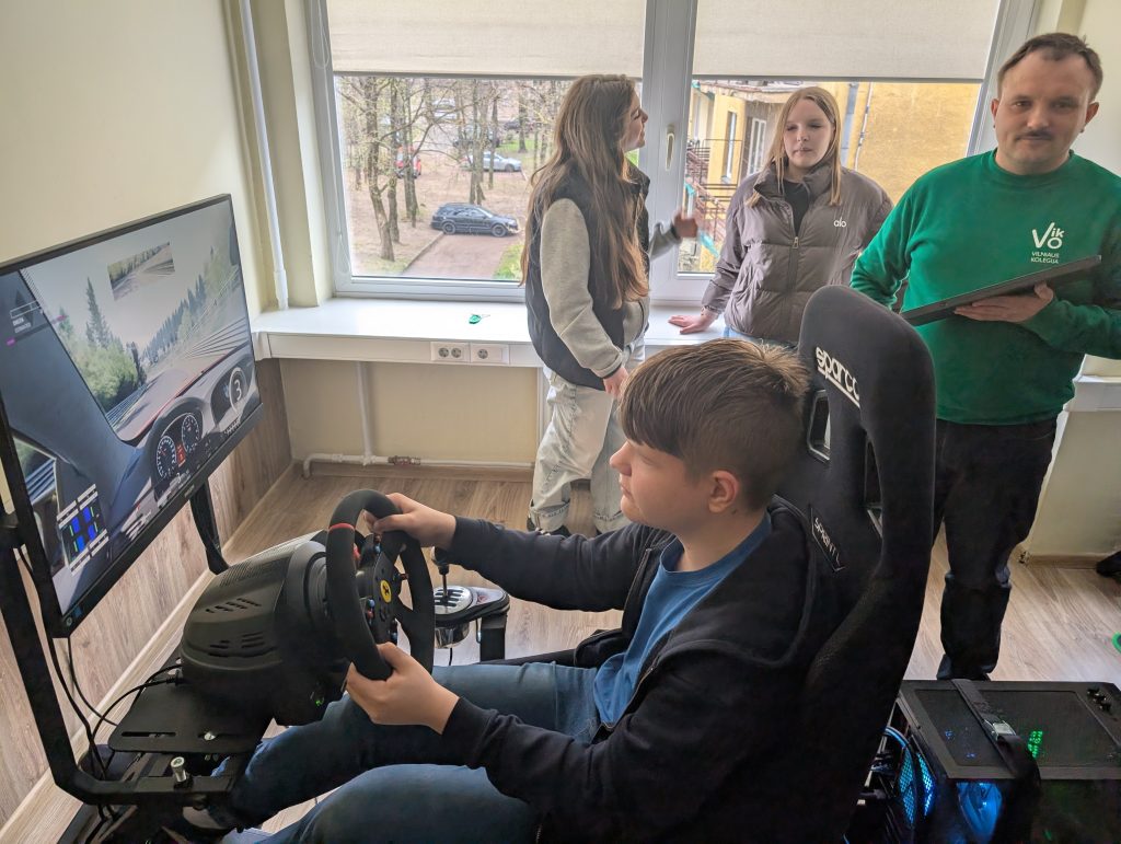 Mokiniai taip pat turėjo progą išbandyti ir fakulteto Žaidimų kūrimo laboratorijoje esančias žaidimų kėdes, kurias moksleiviams parodė ir galimybę jas išbandyti suteikė Programinės įrangos katedros vedėjas Justinas Zailskas.