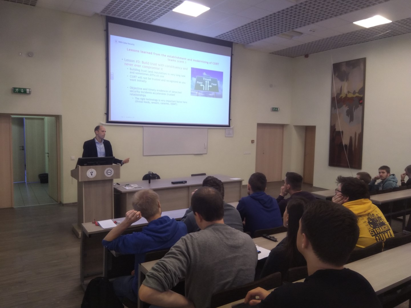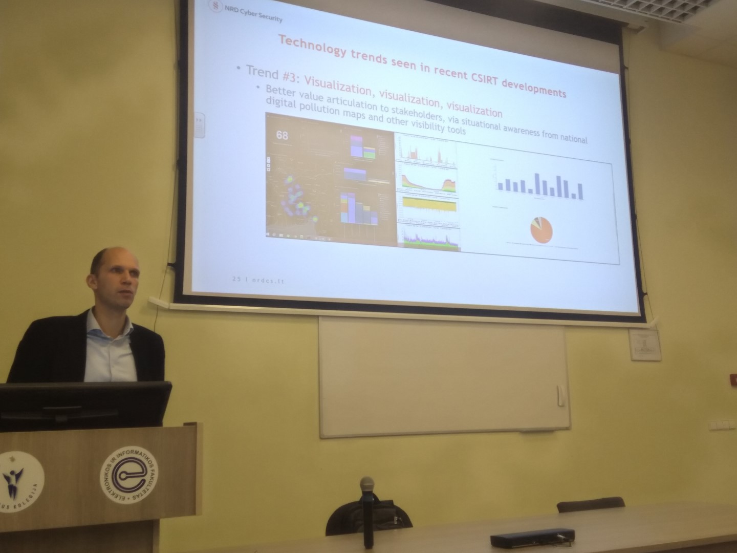 2019 m. spalio 29 d. su nekantrumu laukėme ne įprastos paskaitos, o ilgai planuoto susitikimo su socialinių partnerių NRD CS atstovu, Informacijos saugos specialistu Sigitu Roku. O suplanavome susitikti kartu su Elektronikos ir informatikos fakulteto dėstytojais bei studentais, norėdami pasidalinti profesine patirtimi ir kibernetinio saugumo srities vystymosi tendencijomis.