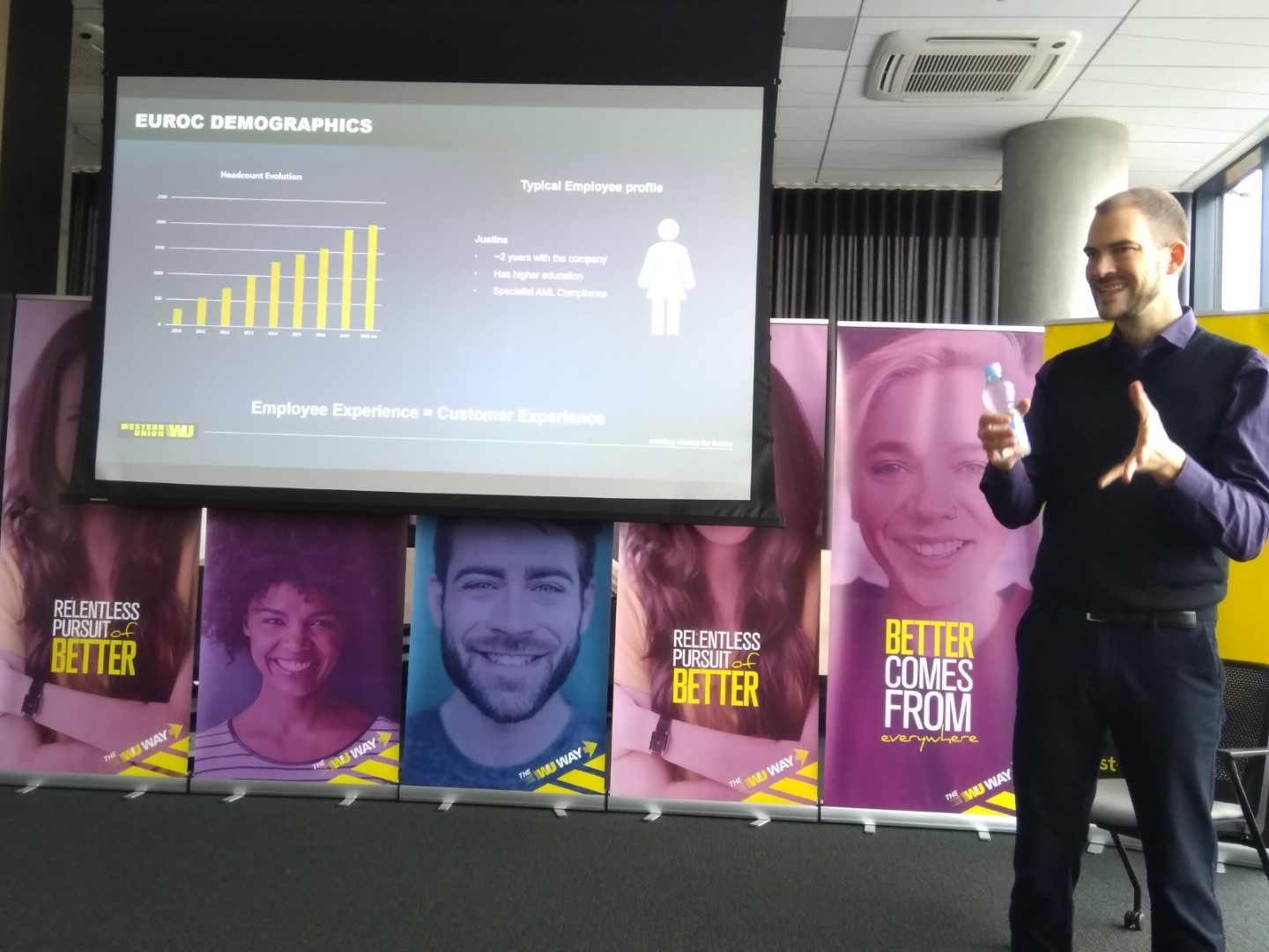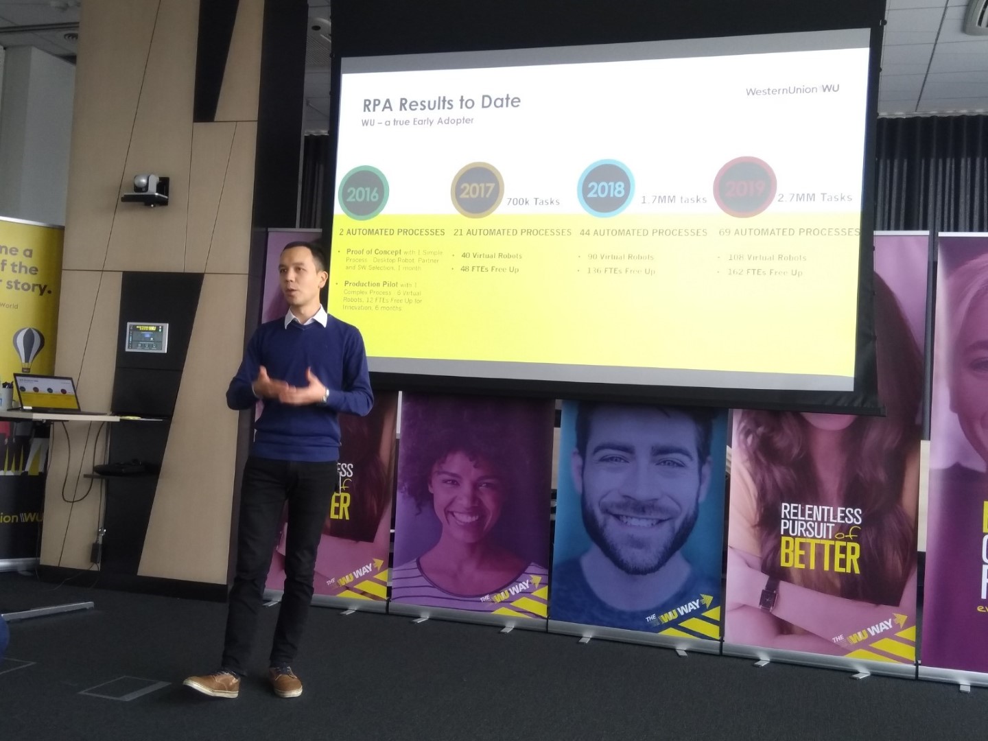 Informacijos sistemų studijų programos III-ojo kurso studentai, kartu su Informacinių sistemų katedros dėstytojomis, 2019 m. lapkričio 12 d. buvo pakviesti į Western Union Processing Lithuania atstovybę, kuri įsikūrusi sostinėje. Susitikimo metu vyko organizacijos veiklos principų, organizacinės kultūros, personalo valdymo ir veiklos vystymo tendencijų pristatymas, kurį atliko HR Talentų komandos vadovas Europos regionui. Visus nustebino tai, kad Western Union Processing Lithuania padalinys esantis Vilniaus mieste yra didžiausias šios tarptautinės organizacijos padalinys visame pasaulyje ir be kitą ko, žadantis plėstis. Be to, šiuo metu Western Union paslaugų centras labai aktyviai vykdo rutininių procesų automatizavimą. Plačiau apie tai kalbėjo Procesų robotizavimo padalinio vadovas, savo pranešime pabrėždamas veiklos analitikų poreikį, kurie gebėtų analizuoti veiklos procesus ir išskirti rutinines veiklas, kurios gali būti automatizuotos. Praktinėje dalyje buvo pademonstruota, kaip jų skyrius automatizuoja procesus ir pasidžiaugė, kad šiuo metu jau yra automatizavę 69 procesus, o t.y. atlikta 2,7 mln. užduočių be darbuotojų įsikišimo. Taip pat, klausėmės pranešimo apie projektų valdymą naudojant Agile patirtį, kuri dar visai neseniai pradėta taikyti vykdant projektus organizacijos viduje. Pranešėjas pasidalino savo sėkmėmis ir sunkumais su tikėjimu, kad Agile principų naudojimas leis efektyviau įgyvendinti projektus organizacijos viduje.