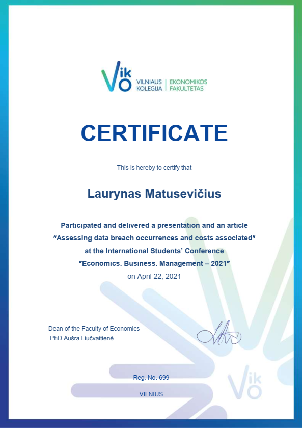 2021 m. balandžio 22 d. Vilniaus kolegijoje vyko 8-ji tarptautinė mokslinėje-praktinė konferencija „Ekonomika. Verslas. Vadyba – 2021“, kurioje dalyvavo ir EIF fakulteto Informacijos sistemų studijų programos Informacijos saugos specializacijos absolventas Laurynas Matusevičius. Konferencijoje Laurynas skaitė pranešimą tema “Assessing Data Breach Occurrences and Costs Associated“ („Duomenų nutekėjimo įvertinimas ir su tuo susijusi žala“), o taip pat kartu su moksline vadove doc. dr. Irma Šileikiene ta pačia tema parengė mokslinį straipsnį konferencijos leidiniui.