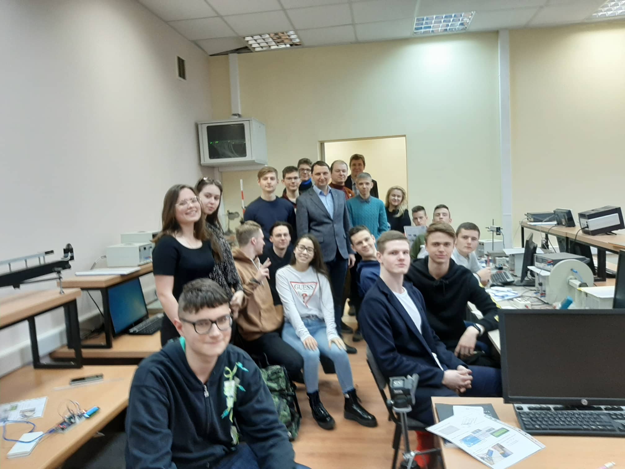 Praktiniu užsiėmimu pasibaigusi Elektronikos katedros dėstytojų – dr. Andžej Lučun, dr. Eugenijaus Mačerausko ir dr. Antoni Kozič – vieša paskaita apie ultragarso taikymą bei vieno iš geriausių mūsų studento Manto Vanago asmeninis liudijimas apie sėkmingas Elektronikos inžinerijos studijas Elektronikos ir informatikos fakultete paliko neišdildomą įspūdį Vilniaus „Senvagės“ gimnazijos moksleiviams.