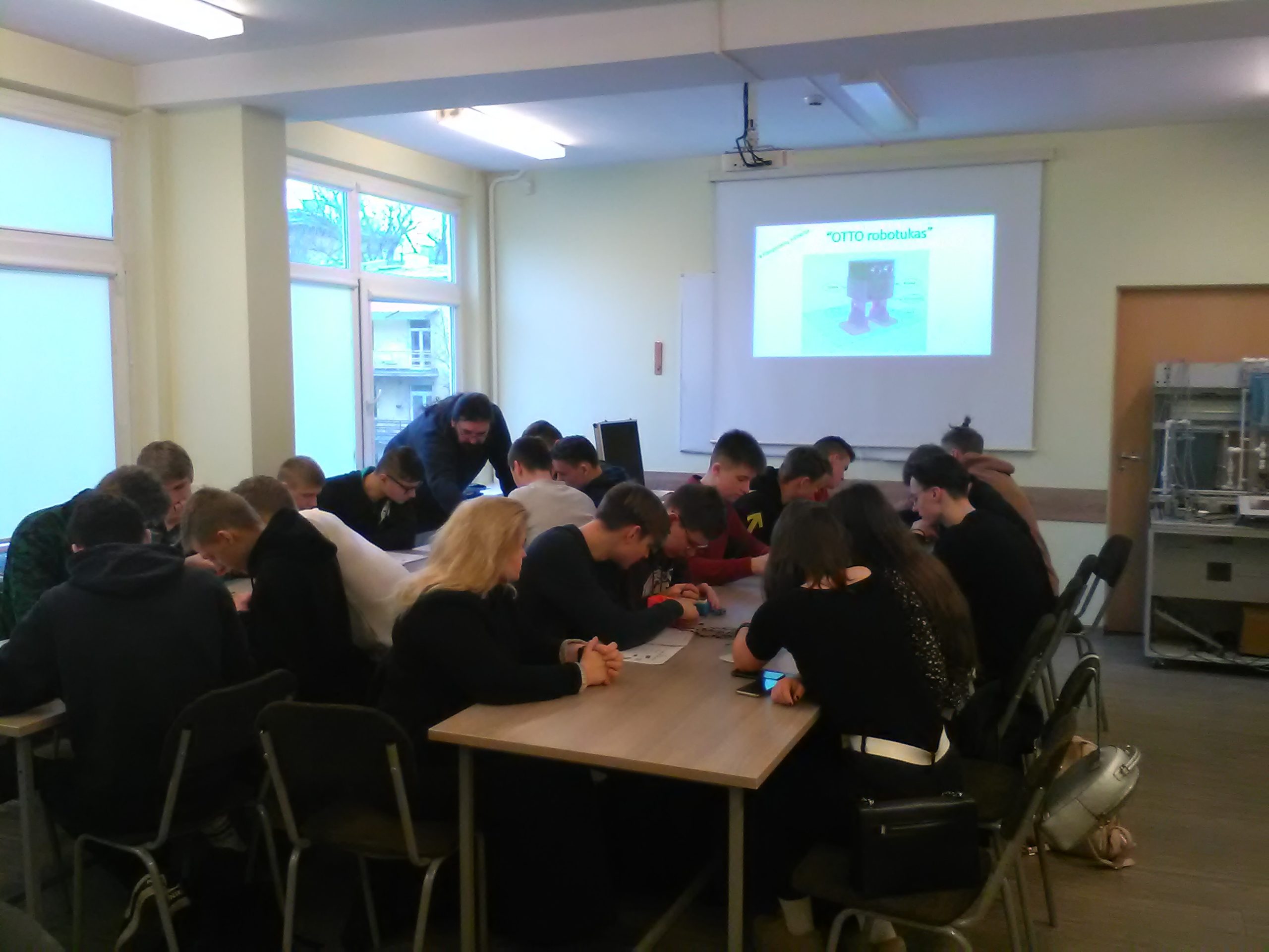 Praktinės – pažintinės pamokos metu mokiniams paskaitą skaitė Elektronikos laboratorijų vedėjas Tomas Kasperavičius ir Kompiuterių sistemų ir telekomunikacijų katedros vedėjas Paulius Šakalys. Pagrindinis paskaitos akcentas buvo skiriamas atvirojo kodo ,,OTTO” robotukų konstravimui ir programavimui. Dešimties linksmųjų robotukų pagalba renginio dalyviai susipažino su robotinių sistemų projektavimo, gamybos ir programavimo etapais ir principais. Taip pat buvo aplankyta studentų popaskaitinės veiklos zona – ,,Robotikos dirbtuvės”, kurioje pristatytas ir pademonstruotas tarptautinio projekto metu minėtose dirbtuvėse gimęs robotas humanoidas ,,Eifure”.